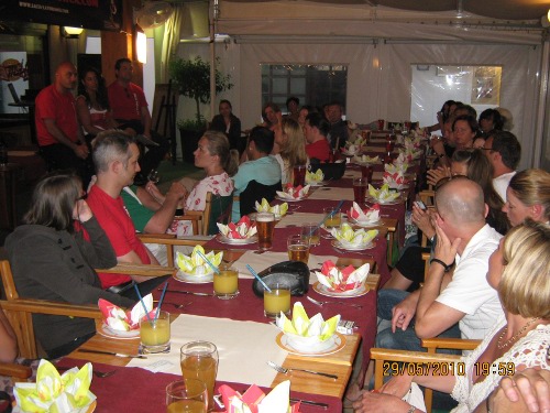 Vor dem Essen war noch das große „Danke sagen“ angesagt wo folgende Geschenke bei herausbekommen sind. Jeder Teilnehmer hat eine recht professionell gestaltete Urkunde für die Teilnahme bekommen. Unsere Gastgeber erhielten einen Blumenstrauß der stellvertretend von der Inhaberin des Mai Tai entgegengenommen wurde und eine Eistorte für die Veranstalter, die aber von allen nicht gegessen, sondern dem Erdboden gleichgemacht wurde. Eine Gruppe hatte noch den alten ABBA Gassenhauer „Thank you for the music“ umgedichtet, welches dann von unserem 4 (vielleicht sind es auch 5 – Ich bin da nicht so der Profi) Oktaven Goldkehlchen vorgetragen wurde.
