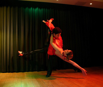 Den Anfang machten Guillermo González & Melanie mit einem Cha Cha Auftritt. Der Moderator in einem Engelskostüm incl. Seidenflügel und Heiligenschein gab vorher noch einige wenige informative Sätze zum Cha-Cha bekannt und die beiden begannen mit einer beachtenswerten Show. Schade, mein Versuch, sich da ein wenig die Figuren einzuprägen war grandios gescheitert. Da wäre sicherlich etwas für das eigene Repertoire dabei gewesen. Die Figuren waren allerdings nicht immer so akrobatisch wie auf dem Foto oben ![]()
