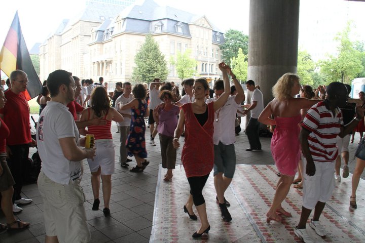 Die ersten Schaulustigen ließen nicht lange auf sich warten und von Elfride K (76) mit Dackel Wuffi (11) und torkelnden Halbnackten mit Deutschlandfahne war so ziemlich alles dabei. Die hatten sich um uns herum versammelt und wurden nicht müde sich das Salsa Treiben anzuschauen. Eine kleine Entwarnung kann ich geben. Wir sind von den Passanten weder gestreichelt noch mit Erdnüssen gefüttert worden. Aber viel hätte nicht gefehlt.