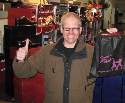 Ich – euer Ralf – ist im Besitz eines nagelneuen Paares Tanzschuhe. JAWOHL. Die Tragweite lässt sich schwer in Worte fassen. Generalstabsmäßig wurde der Kauf geplant. Ich schaue so in das Programmheft und frage mich. „Wann denken nicht 250 Frauen gleichzeitig ans Schuhekaufen ?“ Meine Antwort war: „Wenn ein Zouk Bootkamp stattfindet“ So habe ich mich also im Schutze der allgemeinen Zouk Euphorie zum Schuhstand geschlichen. Als Tarnung habe ich Jacke und Rucksack angelegt. Hätten die Damen mein Ziel erkannt, wären sie vielleicht auf dumme Gedanken gekommen und hätten Zouk doch noch sausen lassen, weil die Schuhe die sie tragen ja mindestens 24 Stunden alt sind. So konnte ich also völlig ungestört und unter sehr freundlicher Unterstützung des „Demi Point“ Personals an meine zukünftige Salsaausrüstung drangehen.